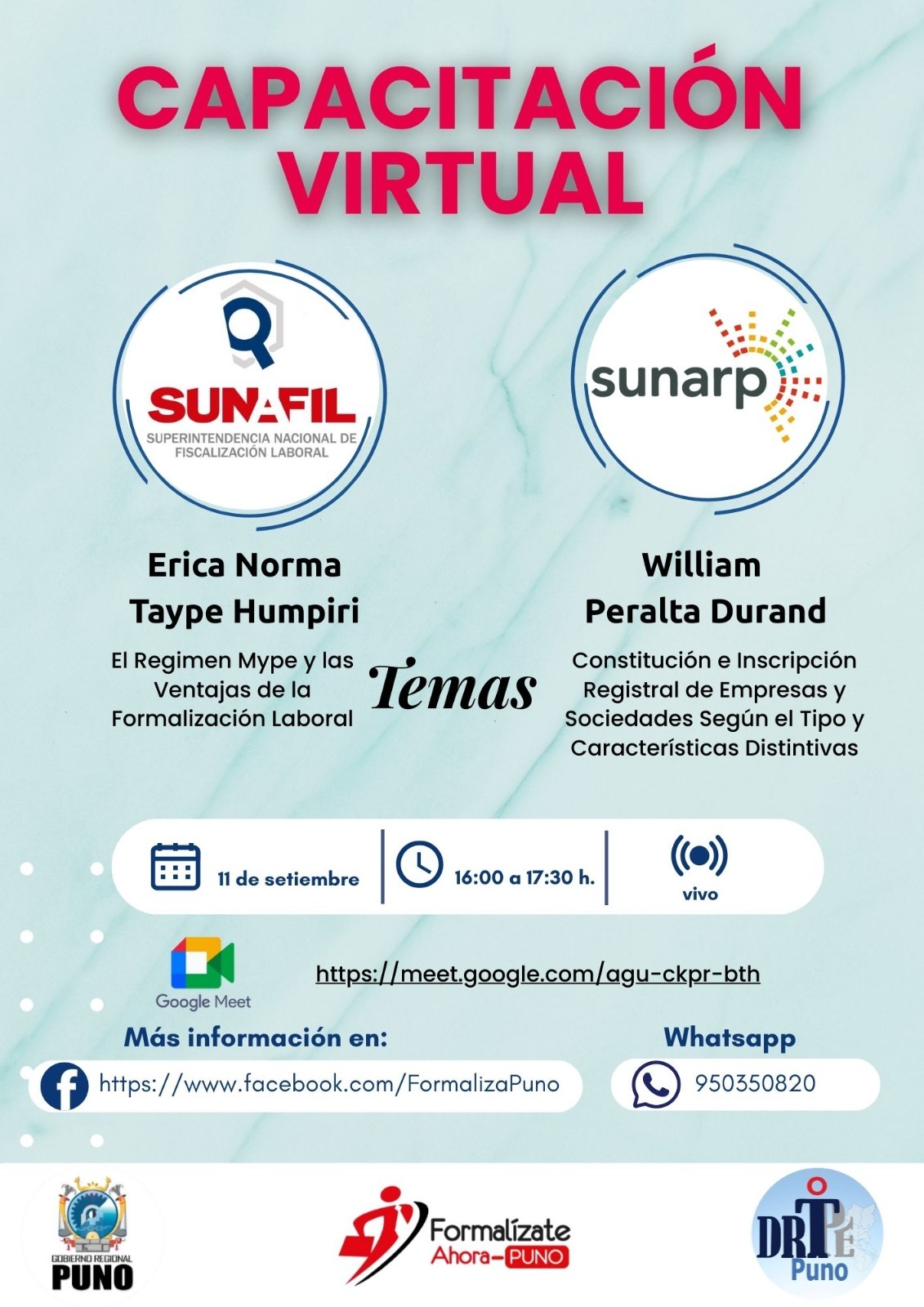 La unidad de Bienestar y empleabilidad invita a evento de capacitación, dirigido a estudiantes y egresados. [11:16, 11/9/2025] Sigma: Colegas coordinadores, difundir el presente a los estudiantes y egresados del programa de estudios correspondiente [11:17, 11/9/2025] Sigma: 📢 CAPACITACIÓN VIRTUAL POR LA FORMALIZACION LABORAL: 🔎 La Dirección Regional de Trabajo y Promoción del Empleo - Puno a través del Centro Integrado Formalízate Ahora, y en trabajo articulado con la SUNARP, nos complace invitarle a la Capacitación Virtual, dirigida a emprendedores y micro empresarios y público en general. ¡No pierda la oportunidad de acceder a información esencial para tu crecimiento laboral! Temas: 👉Constitucion e inscripción Registral de Empresas y Sociedades Segun el Tipo y Caracteristicas Distintivas 👉El Regimen Mype y las Ventajas de la Formalización Lacboral 🗓 Jueves 11 de Setiembre del 2025 ⏰ 04:00 pm 📍 Únete a la reunión aquí: https://meet.google.com/agu-ckpr-bth 🎓 Certificación gratuita para todos los participantes. 👉 ¡Te esperamos! 🚀